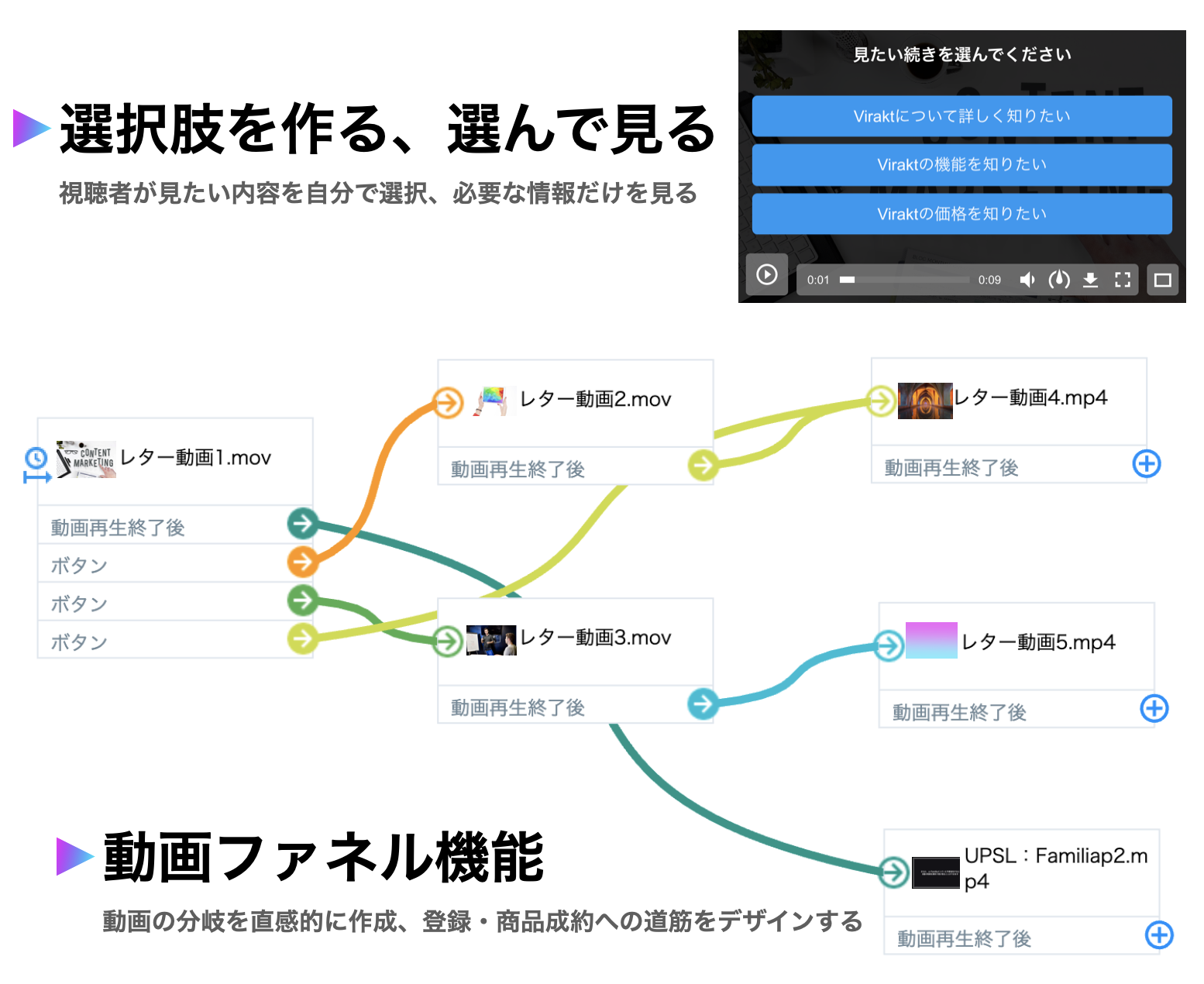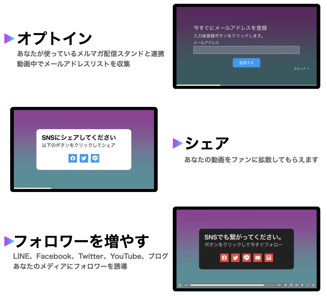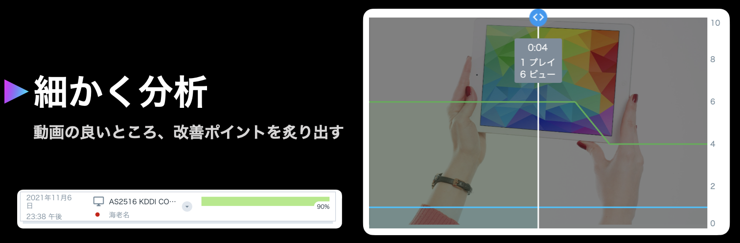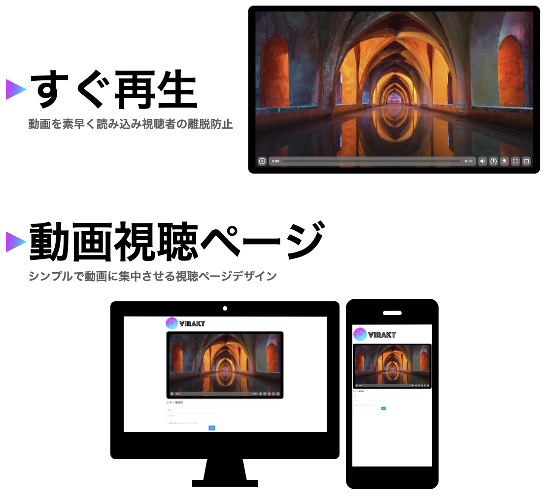 ストレスなくすぐ動画を再生。簡単に動画視聴ページで動画を公開できます。ブランドロゴ、キャッチコピー、動画タイトル、コメントなどの表示・非表示を細かく設定可能。集客・セールスの目標に向けたシンプルかつ強力な導線ページに仕上がります。さらにページの公開期限設定も可能。限定性のトリガーを使ったマーケティングにも力を発揮します。動画の埋め込みコードも1クリックで発行できるので外部サイトへの埋め込みも簡単です。