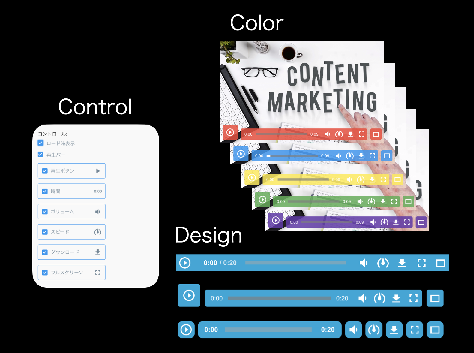 再生バーや再生ボタンの色をあなたのブランドに合わせて好みの色に変更可能