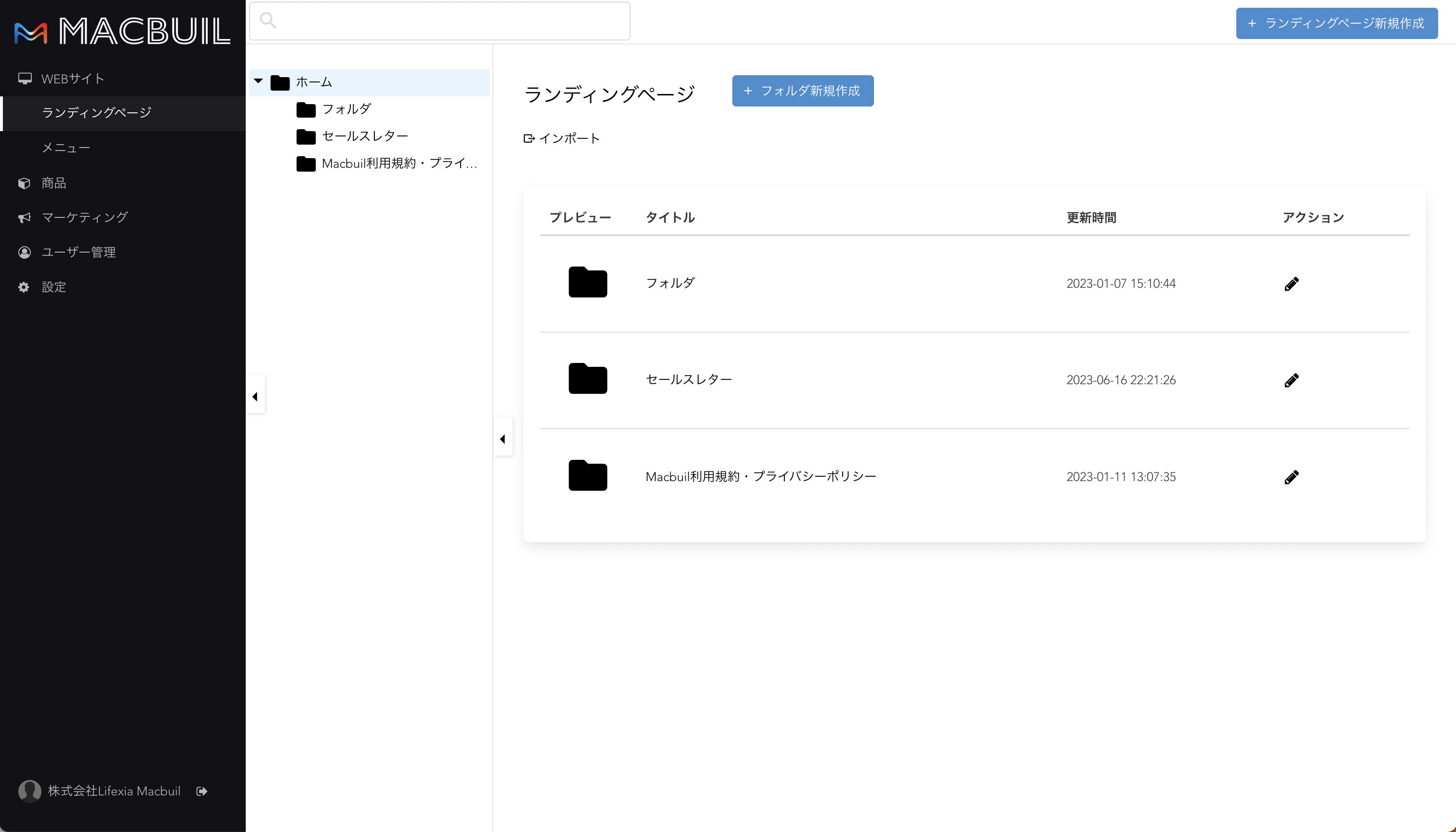 あなたが作成したWEBページはフォルダでわかりやすく管理することができます。必要なタイミングですぐにWEBページを探して編集、URLの取得、公開/非公開の設定変更などを行うことが可能です。